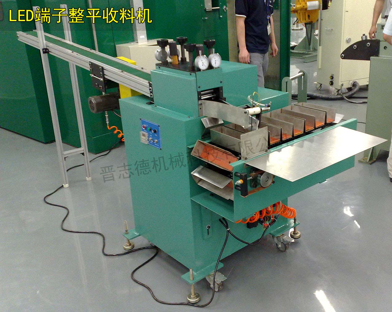 晉志德LED端子整平收料機由輸送帶、整平裝置、收料裝置三部分組成,由連續模所沖制的略彎端子、半導體、LED、電晶體等電子元件類的支架經由輸送帶輸送進入整平機的上下滾壓輪間,經整平后的電子元件類支架再由收料裝置予以計數收料、堆疊,堆疊一定數目后可自動移送以供取出,整平收料速度能達30片/min,大了滿足了端子廠整平收料之需求。