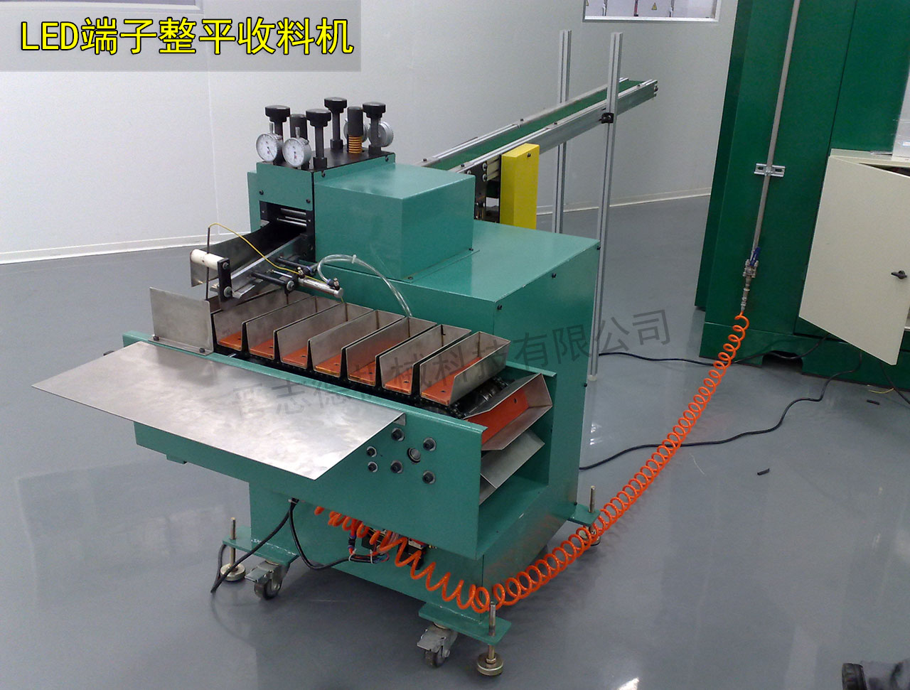 端子整平機雖也有整平機之名,卻不是單單的整平機而是一臺集輸送、整平、收料、包裝于一體的自動化設備,其準確的名稱應為LED端子整平收料機。